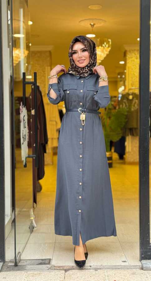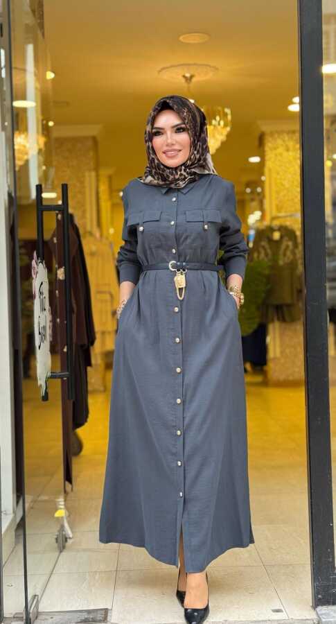 31016 ÇAĞLA KEMER KİLİT DETAYLI ELBİSE FÜME