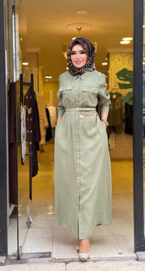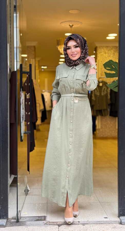 31016 ÇAĞLA KEMER KİLİT DETAYLI ELBİSE YEŞİL