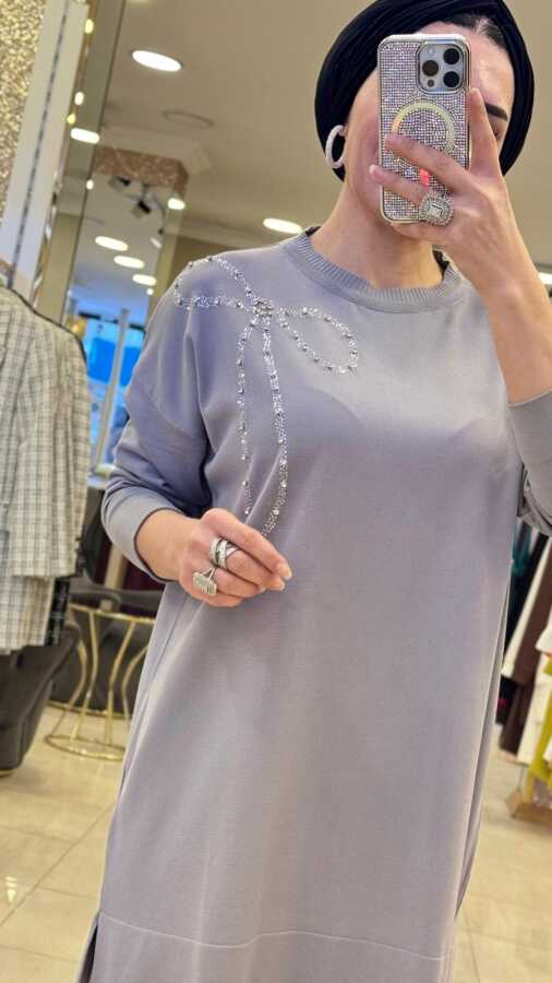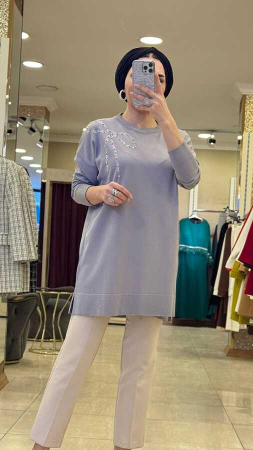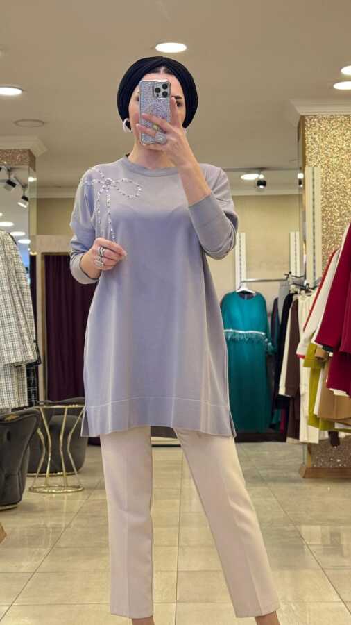 1317 DEGAJE YAKA TRİKO TAŞLI TUNİK EKRU